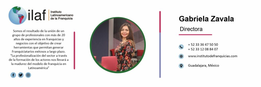 Directora General de franquiciatunegocio. Presidenta de la Asociación de Franquicias de Jalisco (FRANJAL). Socia fundadora del Instituto Latinoamericano de la Franquicia (ILAF).